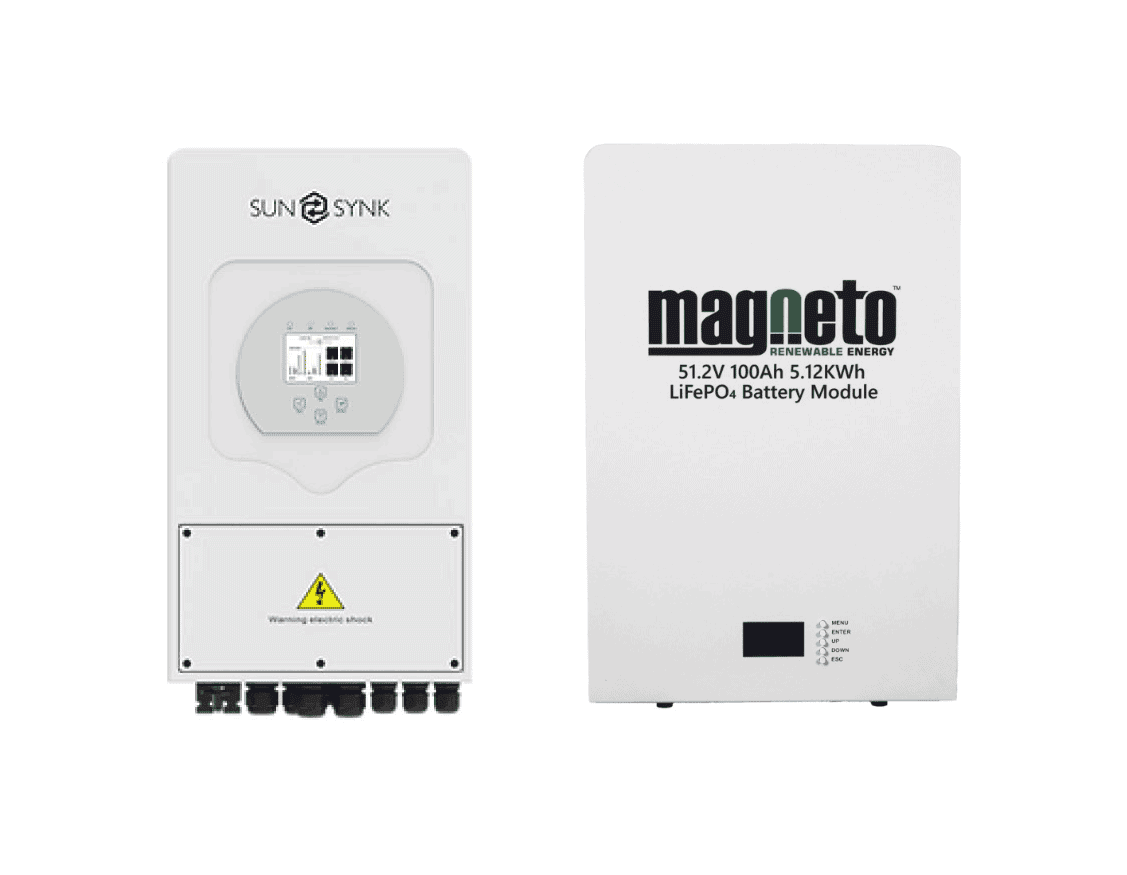 Sunsynk 8kW 1P Hybrid PV Inverter 48v C/W Wifi Dongle IP65 and Magneto Lithium LifePo4 Wall Mount 5.1kWh Battery